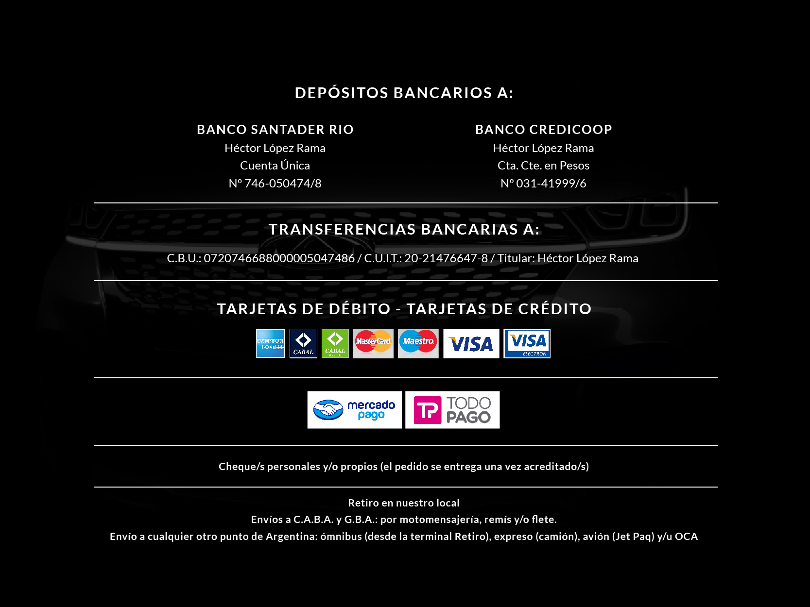 En Chery Warnes, nos dedicamos a la importación, fabricación, venta y distribución nacional de la línea completa de repuestos, autopartes y accesorios para vehículos CHERY: Arrizo 5,Tiggo, QQ, Face, Skin y Fulwin. Nuestra trayectoria en el mercado, que data desde 1988, nos posiciona como uno de los principales proveedores de piezas de reposición, ya que trabajamos permanentemente para ofrecer el mejor servicio de plaza, cuya piedra fundamental es, además de brindarle el asesoramiento idóneo y proporcionarle la/s pieza/s que precise, el buscar siempre una solución al problema que pudiese afectar a su vehículo. Hacemos entregas puerta-puerta en Capital Federal y Gran Buenos Aires y envíos al interior del país por todos los medios de transporte (ómnibus, expresos y líneas aéreas), lo que, sumado a las formas de pago que ponemos a su disposición, le brinda la posibilidad de comprar el material que necesite sin moverse de su domicilio, con la simplicidad y comodidad que esto representa. Si lo prefiere, le esperamos personalmente en nuestro local, sito en Av. Warnes 1184, (C1414AAY) Cap. Fed., en el corazón mismo de Warnes. Esperamos que, a partir de hoy, pasemos a ser, además de su proveedor habitual, la empresa en la que puede confiar plenamente cuando precise una solución para su CHERY.